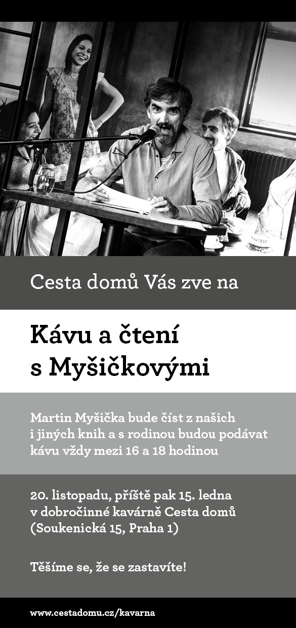 Bára a Martin Myšičkovi jsou dlouhodobými podporovateli Cesty domů a nově jednou za měsíc mezi 16. a 18. hodinou podávají v dobročinné kavárně pohoštění a Martin k tomu čte. Tentokrát povídky a básně nejen současných českých autorů ze všech našich Adventních čtení.