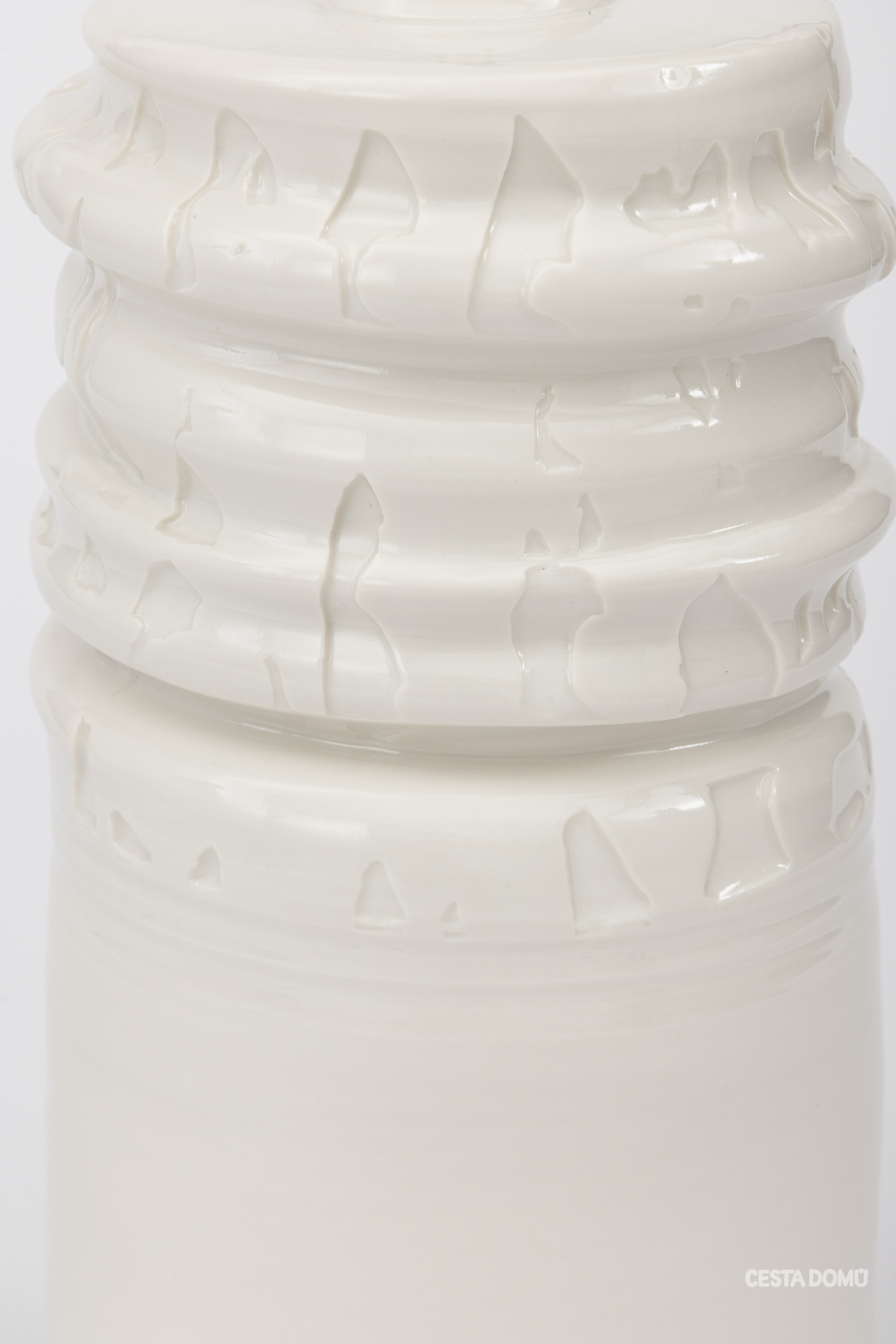 Lampa Pelegrin lumen s výraznou reliéfní strukturou patří do cyklu, v němž si autoři pohrávají s rozdílnou objemností a hustotou porcelánu.