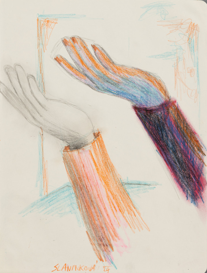 Gabriela Slaninková (*1993) je malířka, kterou zcela zaujala figura, její pohyby, těkání, křehkost. Postavy v jejích velkoformátových obrazech jsou rozpohybované tím, že mají několik končetin. Autorka se soustředí na výraz tváře, dokonce i pohled zanechává stopu barvy, gesta rukou, interakci mezi aktéry příběhů. Letos vystavovala například v humpolecké 8smičce.