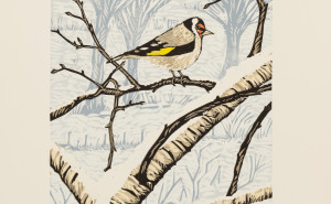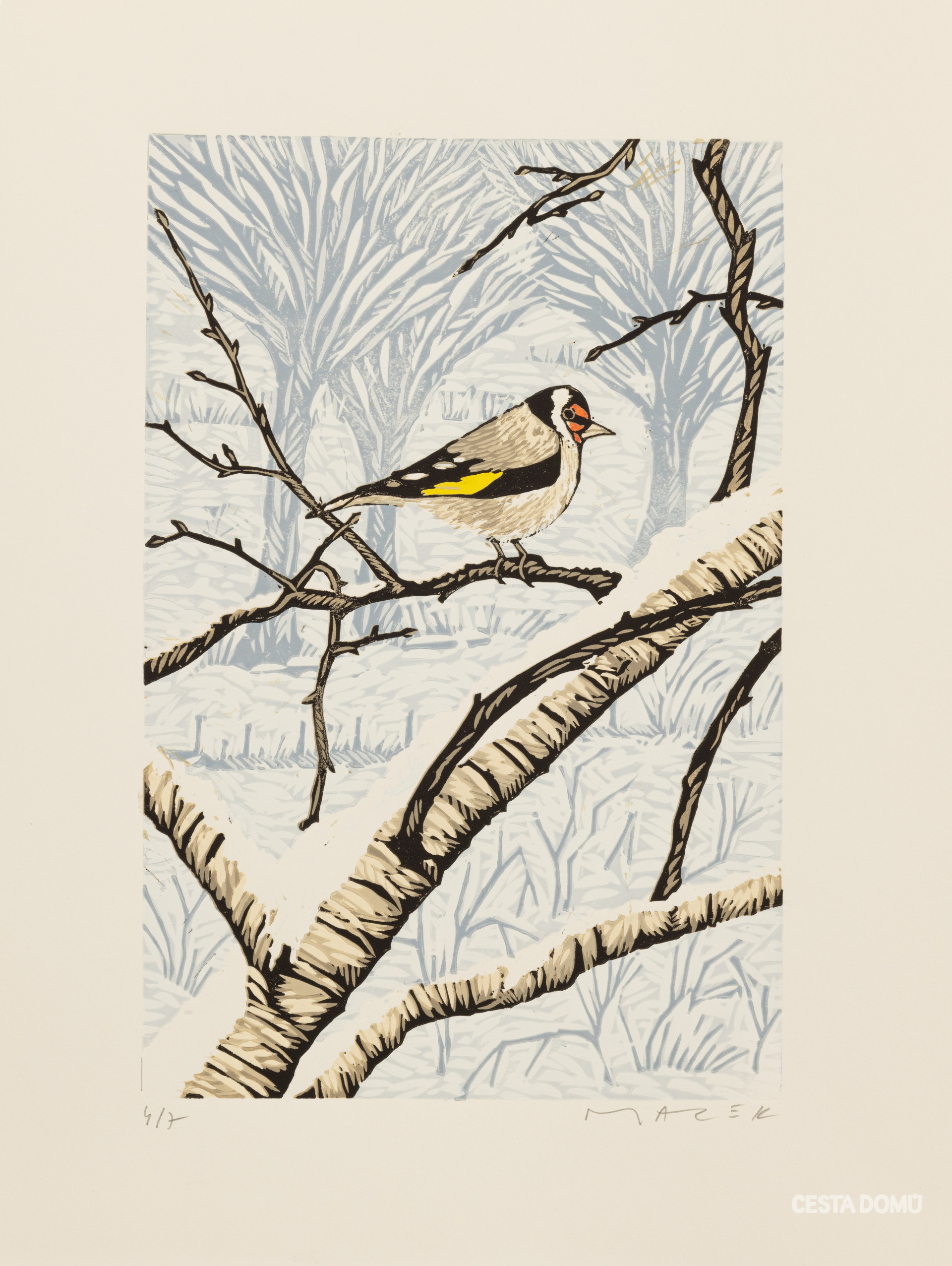 Mnohobarevný linoryt vznikl autorskou metodou dekorativního pokrytí celé plochy s ústředním barevným motivem stehlíka.
